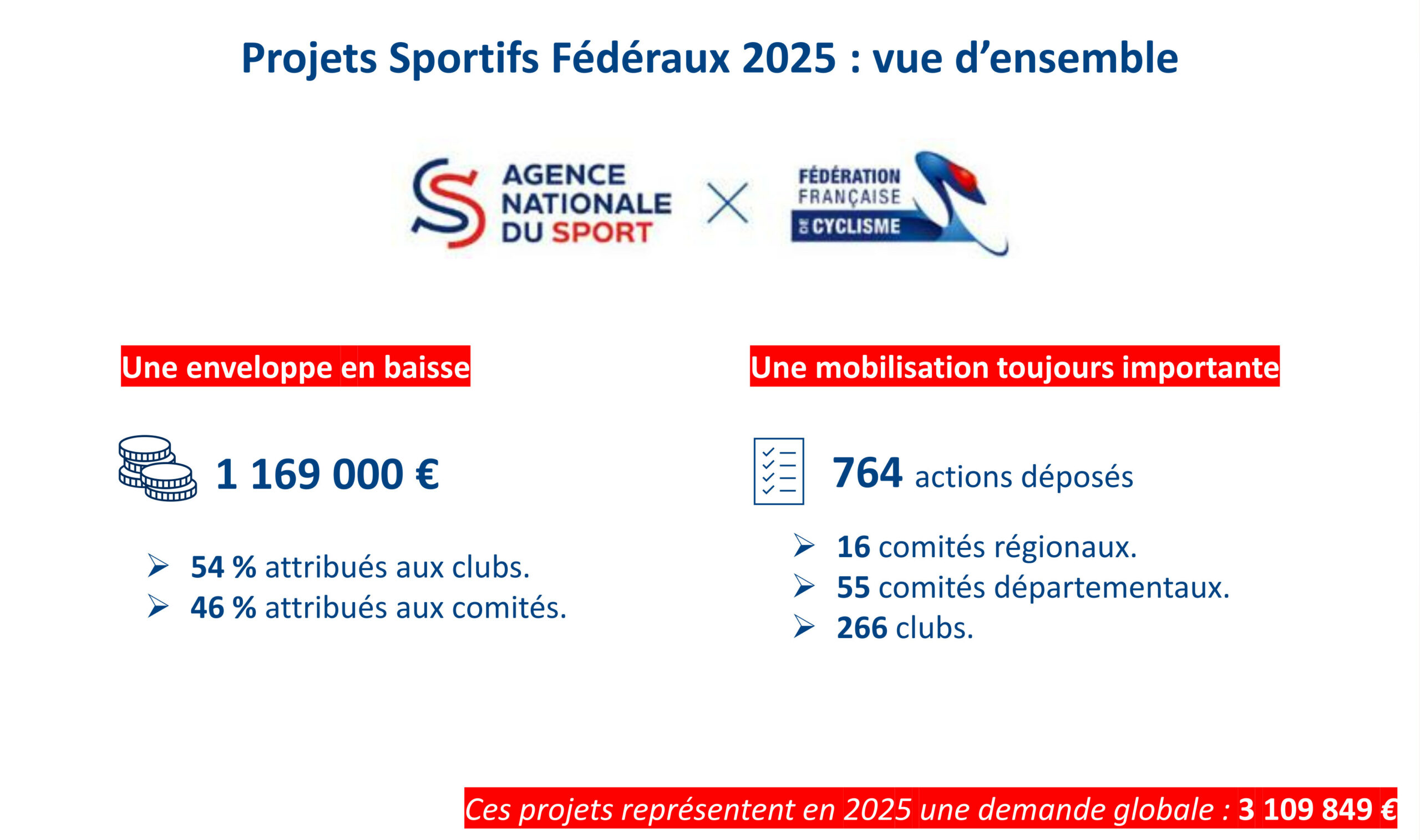 Grâce au soutien de la Fédération Française de Cyclisme, en 2024, 379 structures (soit 804 projets) ont bénéficié d’un financement de l’ANS, pour un montant total de 1 387 600 million €.
